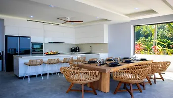 Located fairly close to the Taling Ngam Beach, the 5-bedroom The Headland Villa 2, Samui Koh Samui gives easy access to various tourist attractions in the area. The beachfront villa is featuring a patio with a dining table.